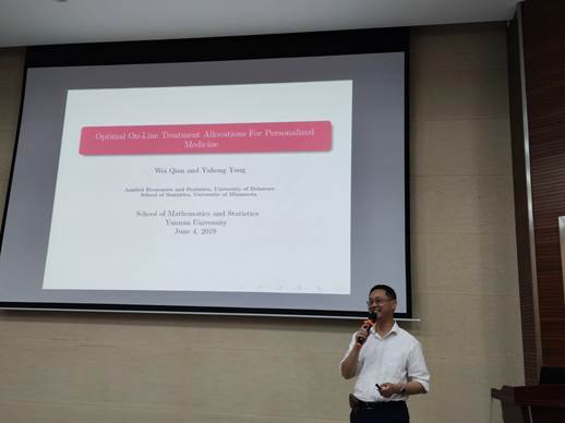 2019年6月4日下午,应公司李建平教授邀请,美国明尼苏达大学杨宇红教授到公司讲学,在伟德国际bevictor19463103报告厅作了题为《Optimal on-line treatment allocations for personalized medicine》的学术报告。本次学术报告由公司经理唐年胜教授主持,副经理李建平教授、丁红林博士、博士研究生及硕士研究生参加了报告会。