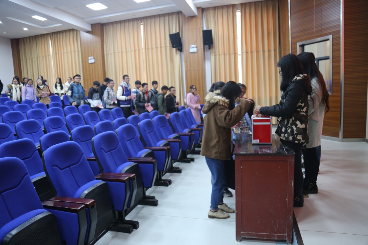 宣读完大会监票人、计票人之后,总监票人在选民的监督下检查本次选举大会开设的两个票箱并用封条封箱。然后选民领取选票并依据说明填出符合自己意愿的选票,大会还开设了秘密选票处,充分体现出对选民权利的维护。填写选票完毕后,选民陆续到格物楼3103投票,选民们将选票投入到票箱,大家在投票的同时也感受到自己作为一名公民的权利。